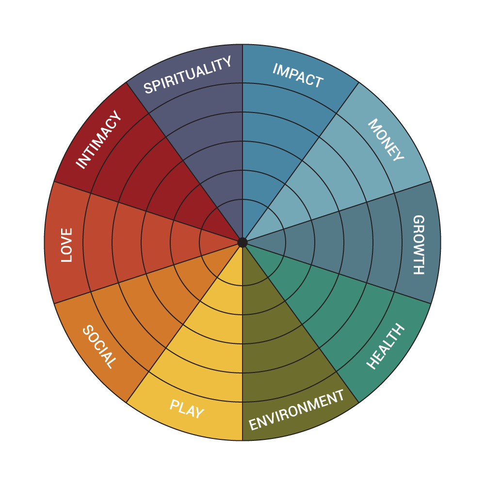 For our Wheel of Life, I will use the following ten categories: Impact, Money, Growth, Health, Environment, Play, Social, Love, Intimacy, Spirituality. These are a merge of categories I found online, and I think they are pretty MECE. See the end of the post of a definition of each.